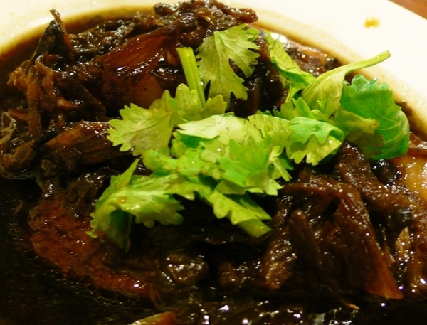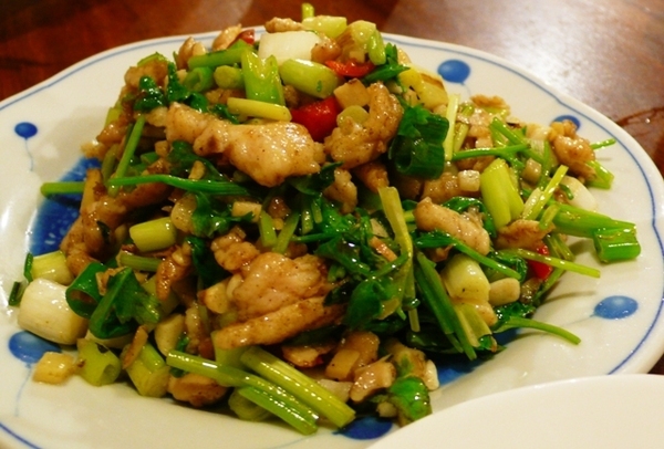 ↓ 這道是服務生力薦的“七味雞柳”,里肌肉炒香菜,帶點醋味,是夏天的下飯好菜。